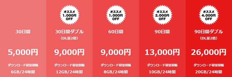 | 90日間ダブル(26,000円)大量にDLしたいなら有り | 20GB(DL量2倍) |